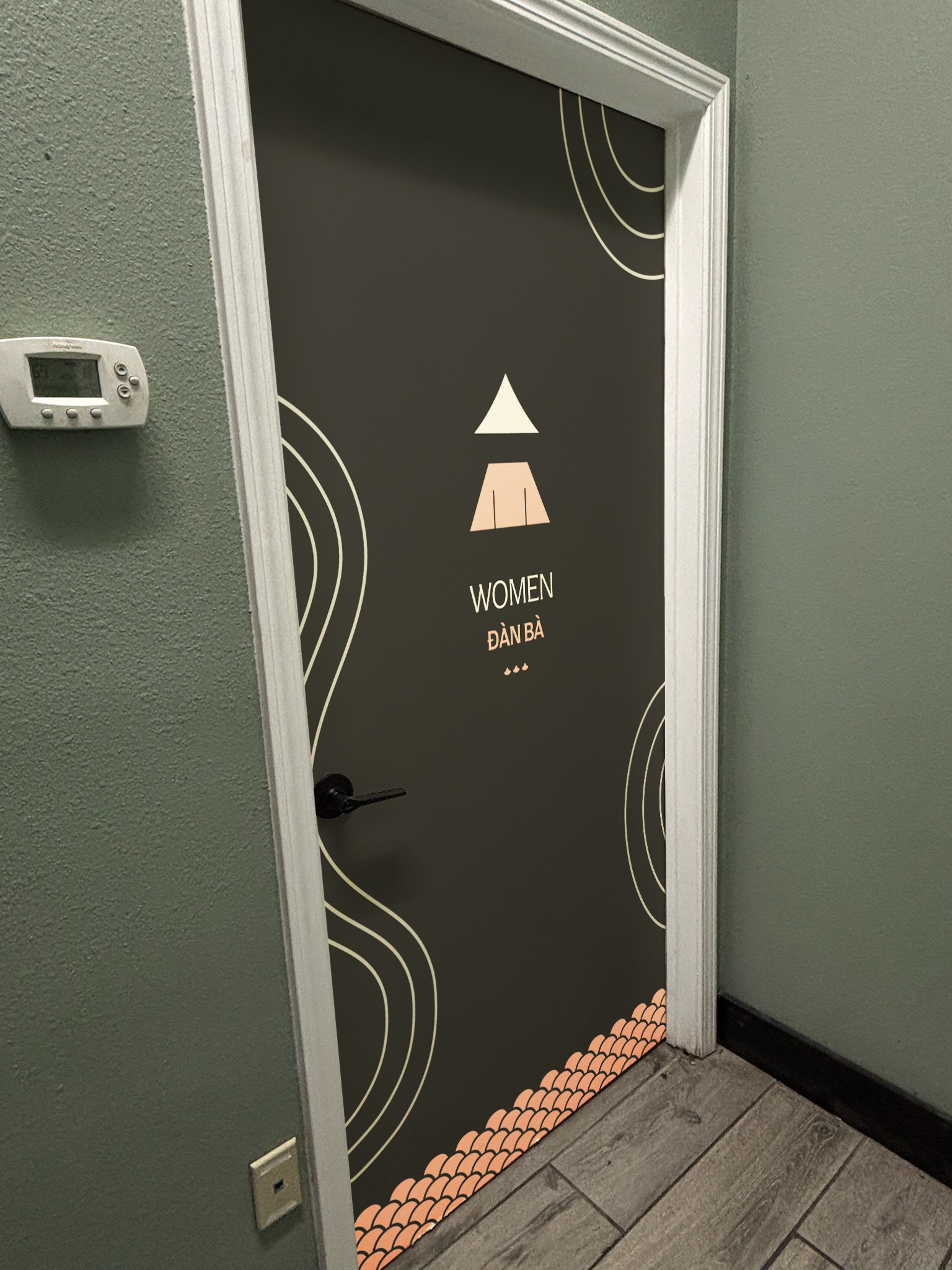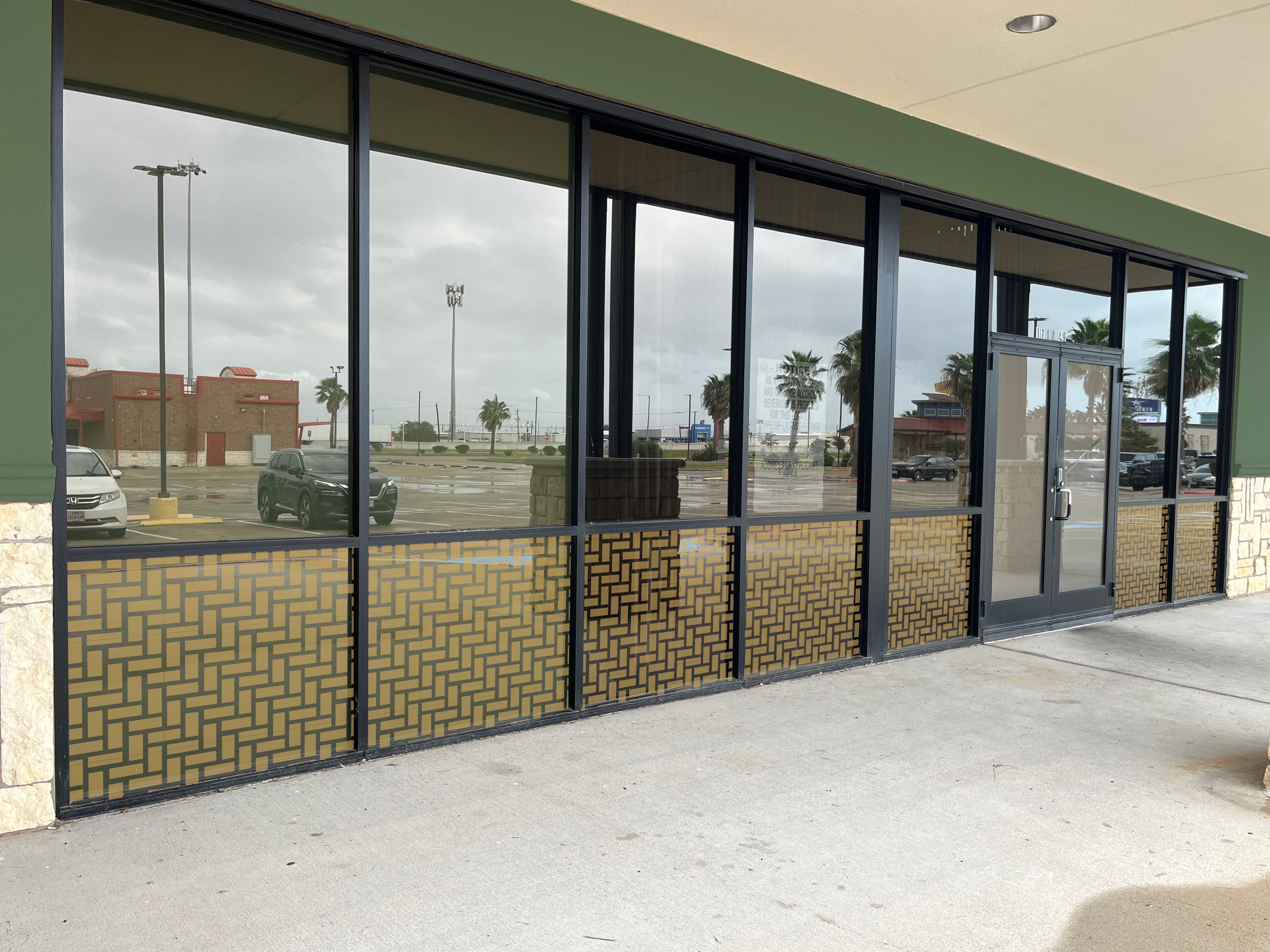 A street sign was added, along with vinyls across the large windows on the entrance. The building sign and front door vinyl were also updated to match the new logo.